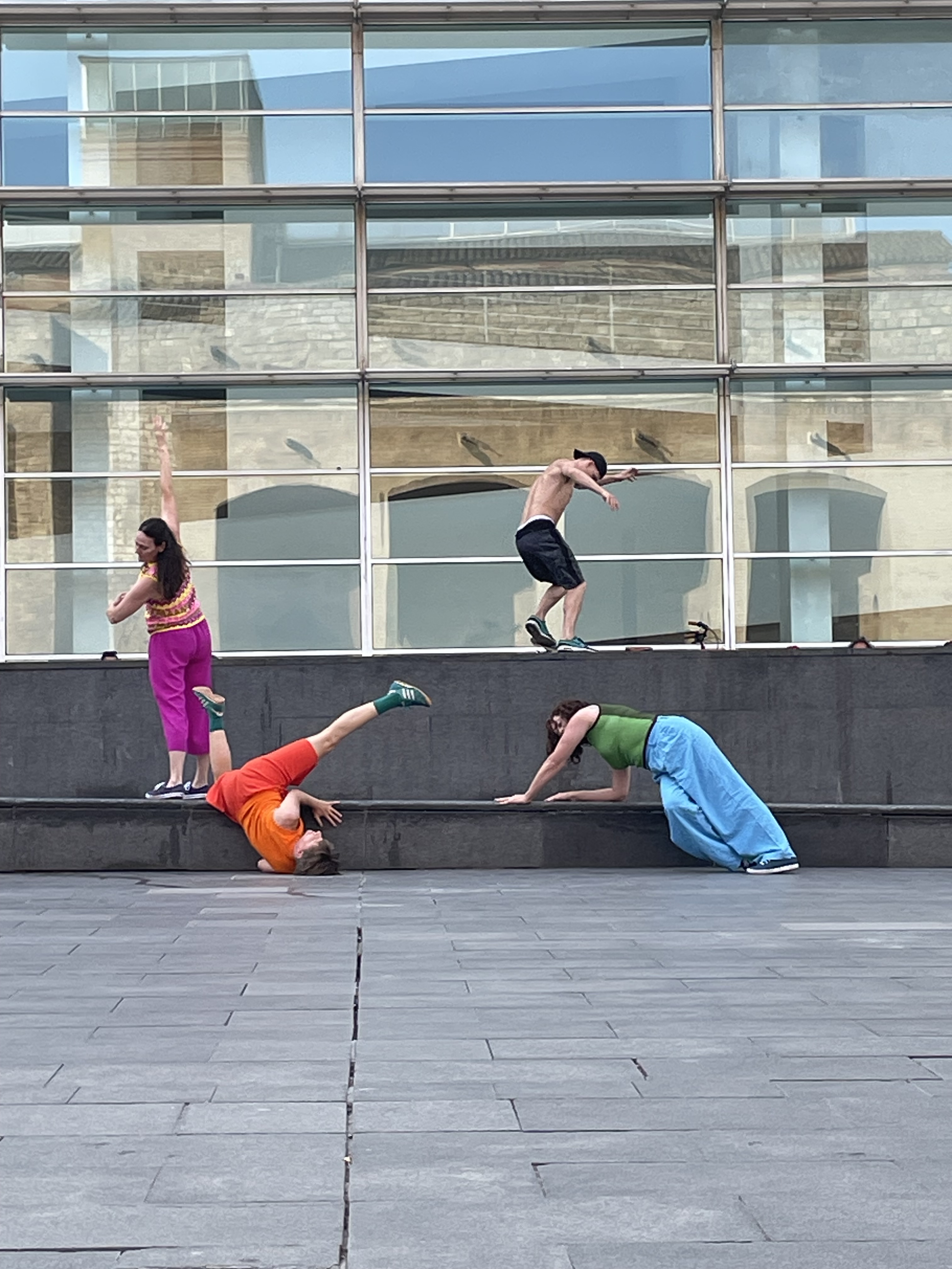 Intrigued by collectively encountering the Catalan capital Bartzelona, three women immerse themselves in the vibrant atmosphere of this Mediterranean metropolis. In dialogue with street-art murals, colourful mosaics, avant-garde and historic architecture, the dancers are-being-moved by the design of public spaces and the flow of daily life of its inhabitants (2024).
